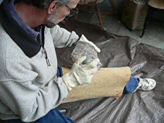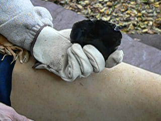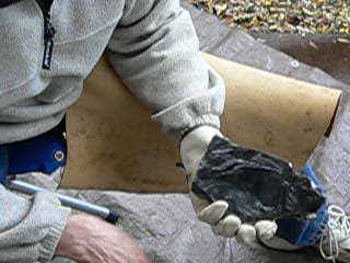 NOTE: Knapping can cause serious harm to your body. Wear gloves and eye protection. Protect your legs and feet by keeping them covered. Always wear protective gear while knapping.