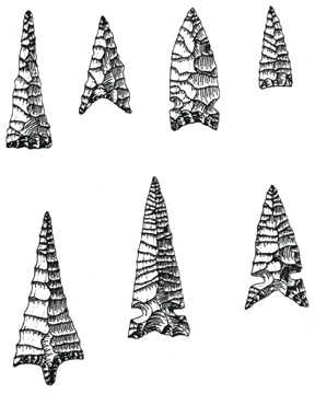 California arrowheads. Top row: from foothills of southern Cascades near Oroville (including Yahi territory), before A.D. 1000. Point on left is desert side-notched style. Bottom row: arrow points from coastal southern California and offshore islands, from A.D. 500 until European contact (All of these and many other stone artifacts are found in Joseph and Kerry Chartkoff's "the Archaeology of California, 1984.)
